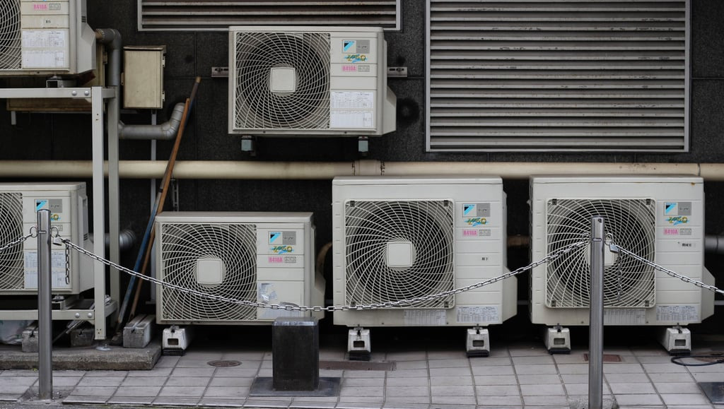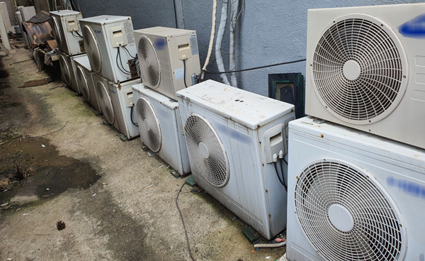 한국 실외기다. 떨어지는 물 때문에 다 바닥에 내려서 설치했다. 양쪽 다 vaporiser가 없다.