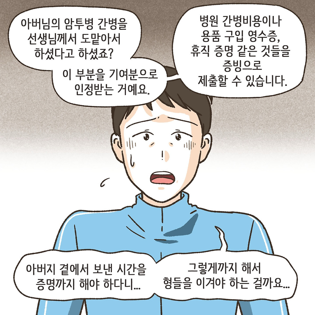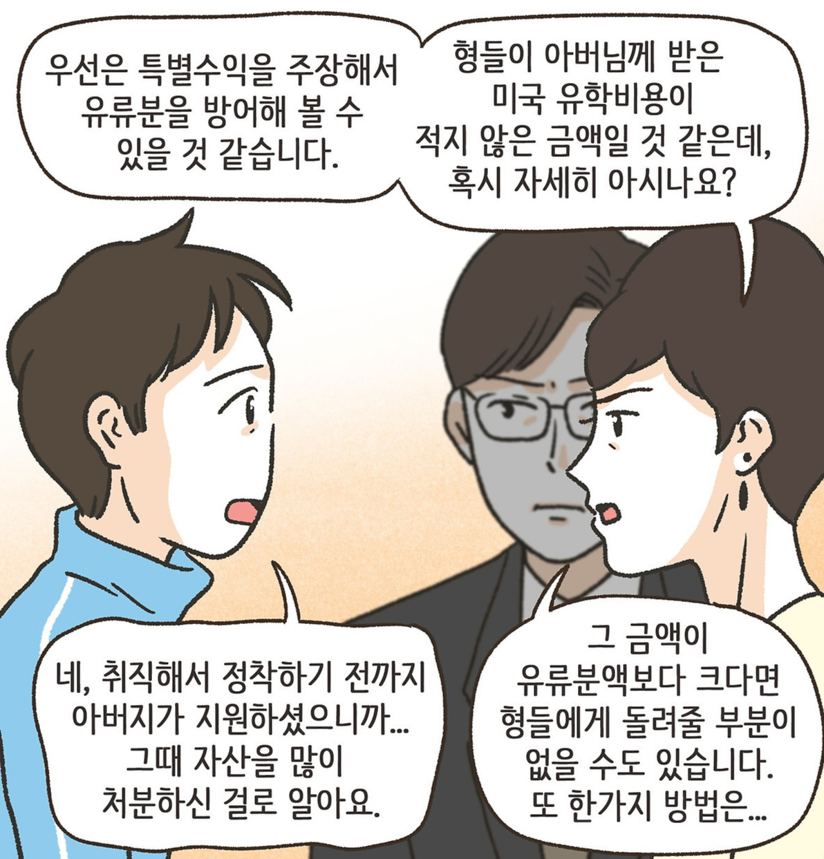 동생이 변호사에게 물어보니 특별수익과 ’기여분‘을 주장할 수 있다고 말한다. 아버지는 형들의 미국 유학비용을 대주기 위해 자산을 많이 처분했었다. 또, 아버지의 암투병 간병은 막내가 혼자 도맡았다.