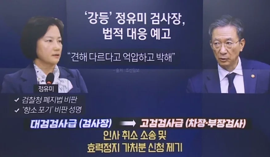 정유미 검사장이 고검검사로 발령을 받자 발령취소 항고소송을 냈다. 검사장은 장관의 통제를 받는 공무원이 아니고 초법적인 존재이고 법원과는 한통속이라는 반증이다.