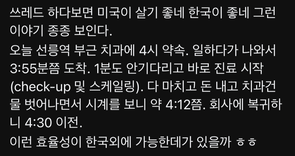 예약이 밀려 한달뒤 아랫니 6개 4시간, 3주뒤에 점검 3시간을 받았다. 그래서 깨달은게 한국 스켈링은 쇼였다는 거다. 플래닝하면 피가 많이 나고 아픈데 의사가 그렇더라 고통에 엄청 강하더라고..