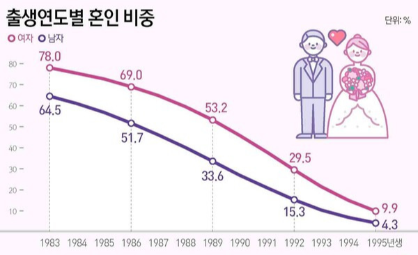 둘째, 청년, 3,40대까지 비혼주의자가 많다. 연애를 하지도 않고 아예 이성을 쳐다보지도 않는다는 말이다.
