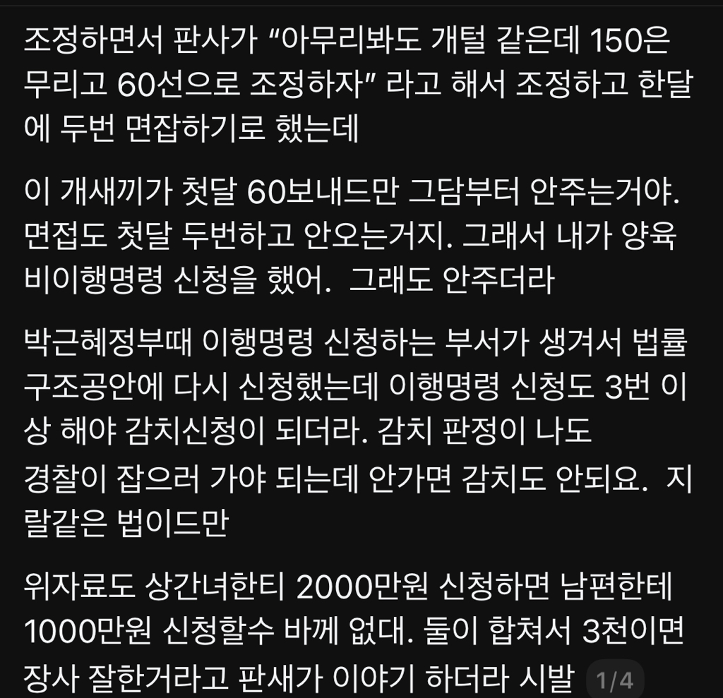 한국 이혼녀가 스레드에 올린 글이다. 몰랐던 법률구조공단에 양육비이행명령 신청부서가 생겼고, 3번 신청해서 안주면 감치가 가능한데 경찰이 감치 결정이 나도 안간다는 거다.
