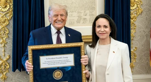 베네수엘라의 야권 지도자 2025년 노벨 평화상 수상자인 마리아 코리나 마차도가 2026년 백악관에서 트럼프에게 노벨상 메달을 선물로 건넸다.